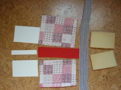 Для начала подготовим все необходимые детальки: картонные заготовки для обложки и корешка; паралон для сердцевины (так называемые странички, только они не листаются) - у меня под рукой был только тонкий паралон, поэтому я вырезала два одинаковых прямоугольника, причем они по размеру чуть меньше, чем картонная обложка для того, что бы обложка как бы выступала немного над страницами как и во всякой приличной книжке :); ленту для "нарисовки" страничек (трикотаж у меня); тканьки для обложки (у меня микровельвет) и корешка (хлопок).